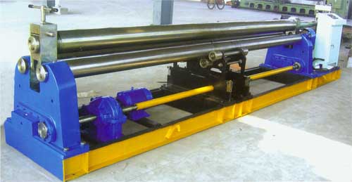 本機結(jié)構(gòu)型式為三輥對稱式,上輥在兩下輥中央對稱位置作垂直升降運動,通過絲桿絲母蝸桿傳動而獲得。兩下輥作旋轉(zhuǎn)運動,通過減速機的輸出齒輪與下輥齒嚙合,為卷制板材提供扭矩。本機床結(jié)構(gòu)緊湊,操作維修方便。